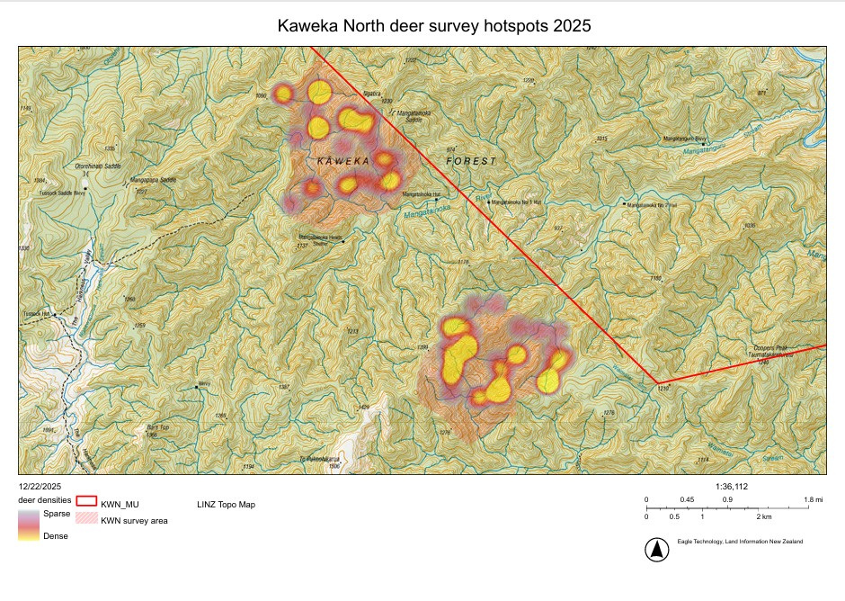 As part of the Adaptive Deer Management & Research Plan Kaimanawa & Kaweka 2022 – 2025 and deer management operations during the spring of 2025, thermal assisted surveys were conducted in two areas of interest to understand deer densities and locations.